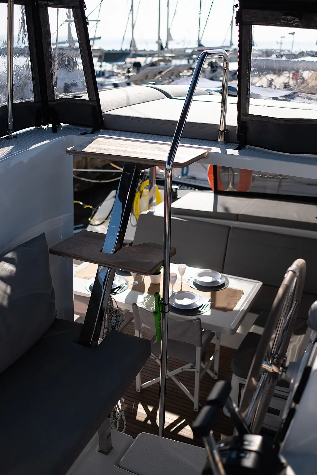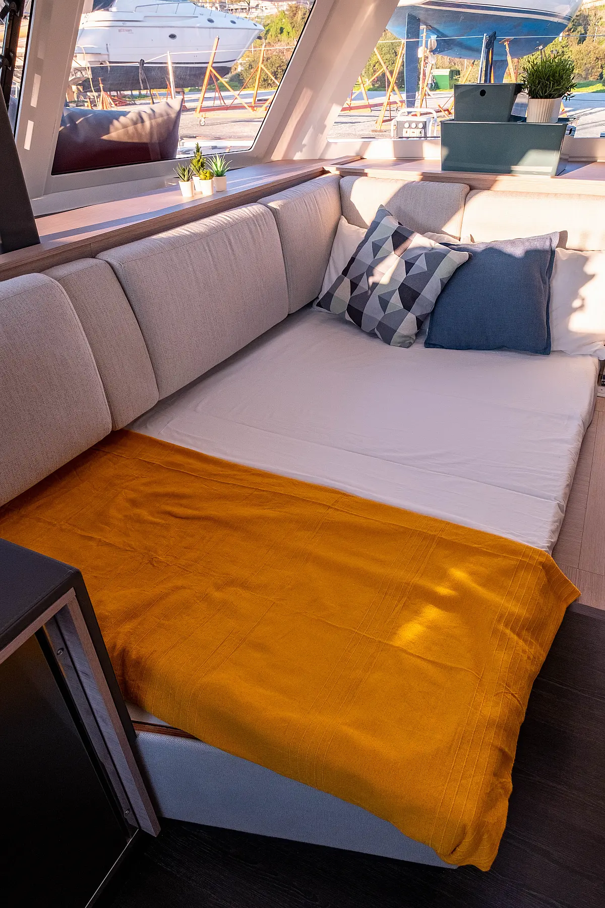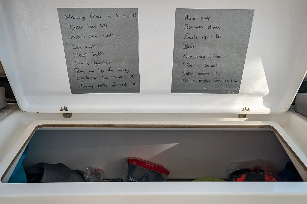 Refrigerator, Cockpit speakers, Electric winches, Dinghy, Air condition, Generator, Inverter, Electric toilet, Solar Panels, Water maker, Outboard engine, Cockpit cushions, Teak Cockpit