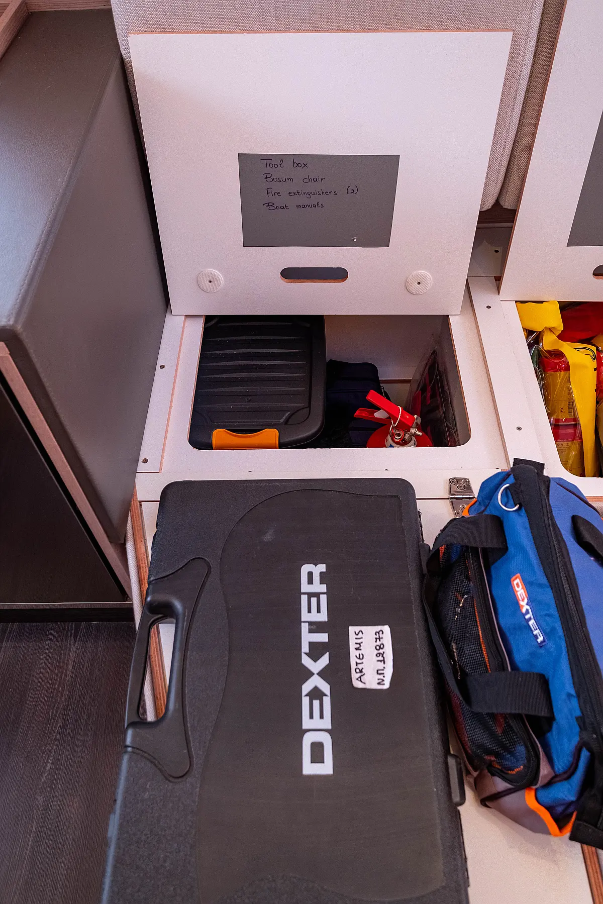 Refrigerator, Cockpit speakers, Electric winches, Dinghy, Air condition, Generator, Inverter, Electric toilet, Solar Panels, Water maker, Outboard engine, Cockpit cushions, Teak Cockpit