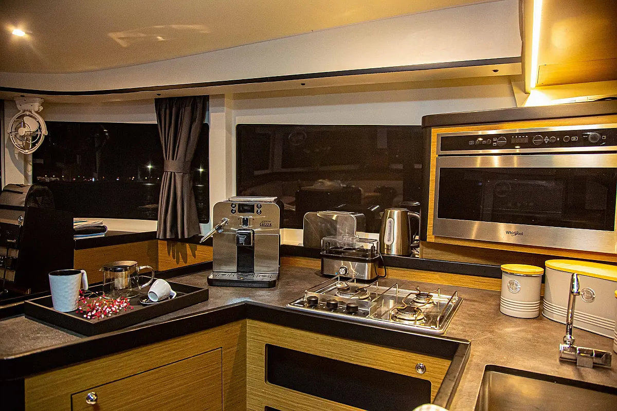 Refrigerator, Air condition, Bimini, Cockpit cushions, Cockpit speakers, Dinghy, Coffee maker, Electric toilet, Generator, Heating, Holding tank, Inverter, Outboard engine, Teak Cockpit, Wi-Fi & Internet